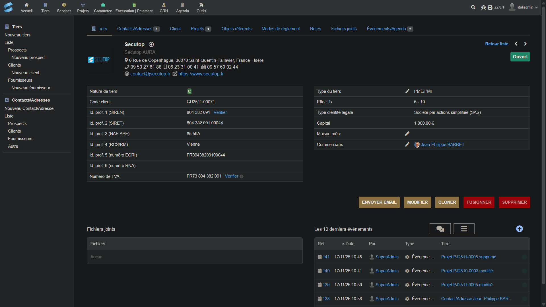 Après un atelier de cadrage pour comprendre les processus internes, les modules essentiels ont été paramétrés selon les besoins de l’équipe : gestion des clients et prospects, édition des devis et factures, suivi des projets, et planification des formateurs. Les modèles de documents et les tableaux de bord ont été personnalisés pour refléter l’identité et les usages de Secutop.